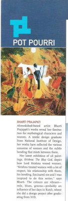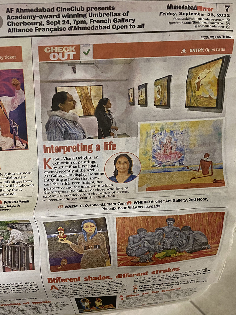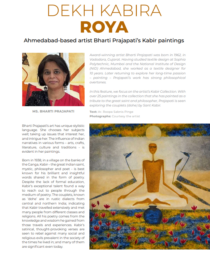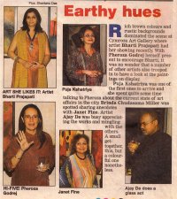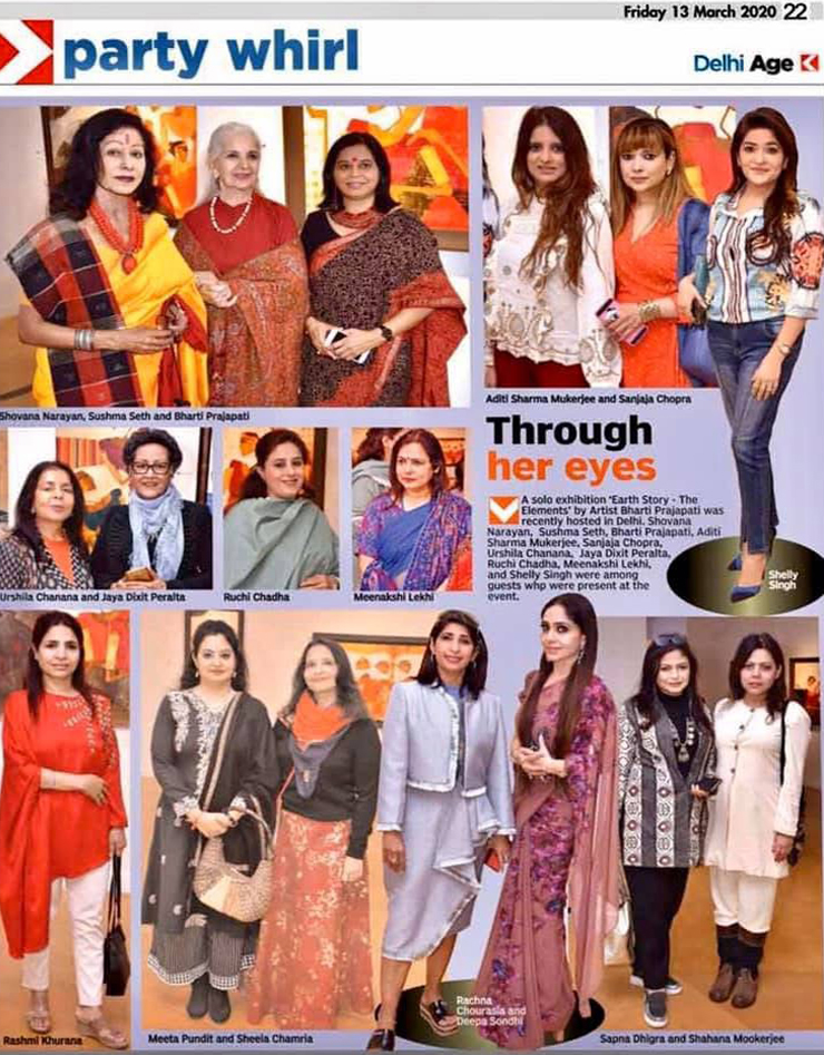 MEDIA Insite Design Magazine http://www.youtube.com/watch?v=dF5-HtEsmnI http://www.insideoutside.in/inside-outside/current-exhibitions/2550/ode-women http://www.cymroza.com/theexhibition.php?eid=15&st=Past http://thegreenelephantdesigns.blogspot.in/2011/01/bold-and-beautiful.html http://www.cpaaindia.org/activities/colorsoflife-2007-sold.htm http://www.thehindu.com/features/friday-review/art/showcase-on-a-figurative-note/article3383537.ece http://artexpoindia.blogspot.in/2013/02/inspirations-behind-bharti-prajapatis.html